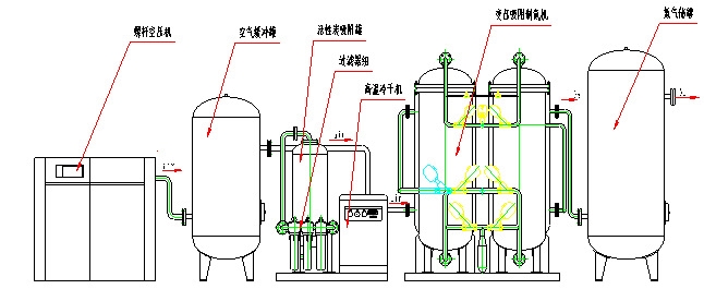 本系统是由一个以空气为原料,由空压机、空气缓冲罐、冷冻式干燥机、精密过滤器、变压吸附制氮机、氮气缓冲罐等设备组成的氮气制造系统。